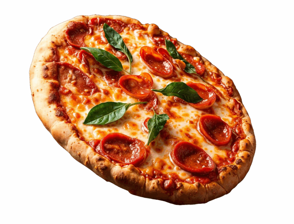 , Paradajkový základ, mozzarella, calabra – pikantná saláma, chilli, slanina, olivy, cesnakový okraj